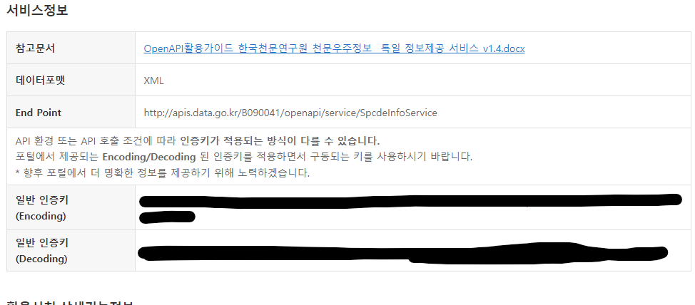그럼 서비스키 앞의 '=' 까지 복사한 다음 주소창에 붙여 넣고, 위에서 발급받은 Encoding 일반 인증키를 붙인다
